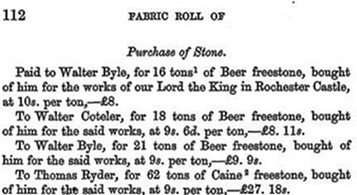 Excerpt from the Fabric Roll for Rochester Castle listing purchases of stone from Beer Quarry.