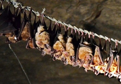 Greater Horseshoe Bats hanging from a wire inside Beer Quarry Caves