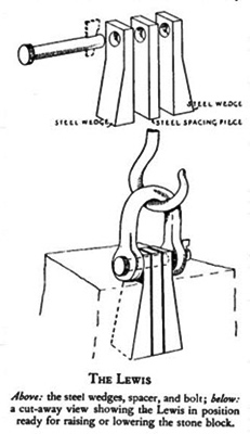 Once approved the block would then be lifted by hand-operated cranes and a Lewis bolt: The stonemason's Lewis is a grapnel, for which a specially shaped socket needs to be cut in the top face of the block of hard, strong stone that is to be lifted however a Lewis could break away in a heavy block of soft stone. Two opposite sides or ends of the socket are undercut, not all four as often pictured. Two projecting wedge-shaped, tapered steel keys are introduced into the socket, and between them is inserted a parallel steel spacer, which spreads the wedges into the undercut parts; then a shackle-pin, or bolt, is passed through the upper extensions of all three, and provides a hold for the lifting chain. The illustration clearly shows how the device works.